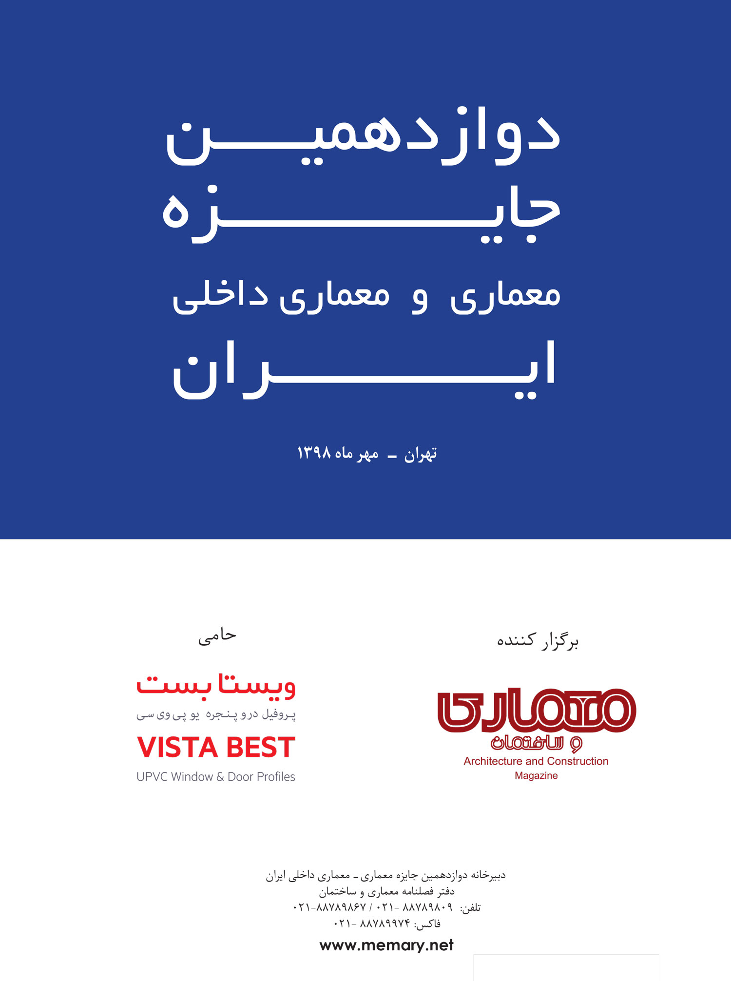 دوازدهمین جایزه معماری و معماری داخلی ایران، با بررسی پروژههای اجرایی، در مهرماه سال 1398 در شهر تهران برگزار خواهد شد.