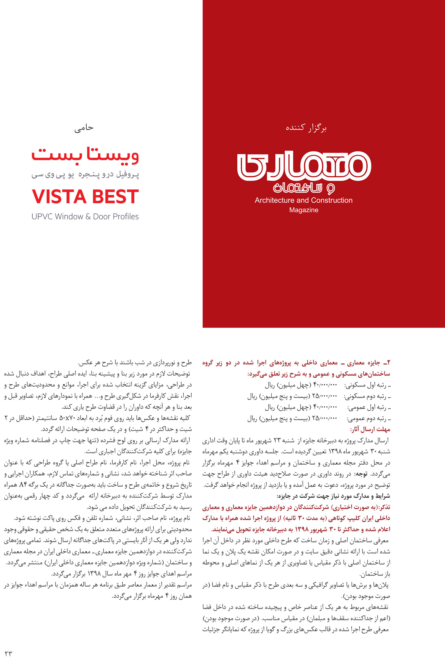 ارسال مدارک پروژه به دبیرخانه جایزه از شنبه 23 شهریور تا پایان وقت اداری شنبه 30 شهریور ماه 1398 تعیین گردیده است. جلسه داوری دوشنبه، یکم مهرماه در محل دفتر مجله معماری و ساختمان برگزار می شود.