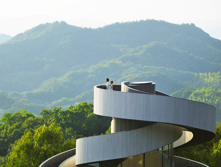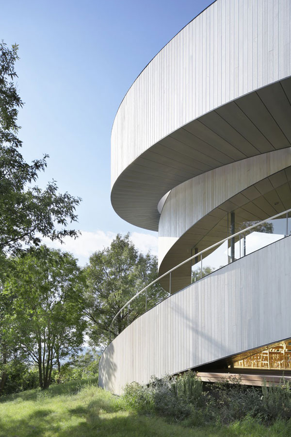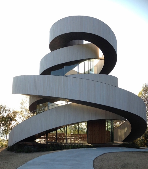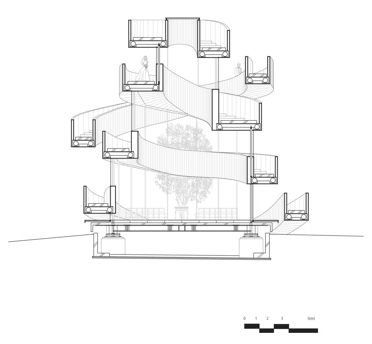 به طور معمول، یک ساختمان از عناصر مجزا تشکیل شده است: سقف ، دیوار و کف. اما در این ساختمان راهپلههای مارپیچ و درهم تنیده هستند که به عنوان سقف، دیوار، و کف عمل میکنند و فضاهای ساختمان را بوجود میآورند. در برخی قسمتها، راهپلهها بر اساس موقعیت و عملکرد عریض تر شدهاند. مثلا در نوک ساختمان که که زوجین همدیگر را ملاقات میکنند؛ یا در مسیرهایی که دیدهای مناسبی دارند؛ همچنین در قسمتهایی که پیشآمدگی لبه بام میبایست عمیقتر باشد تا از فضاهای داخلی در برابر تابش آفتاب محافظت کند.
