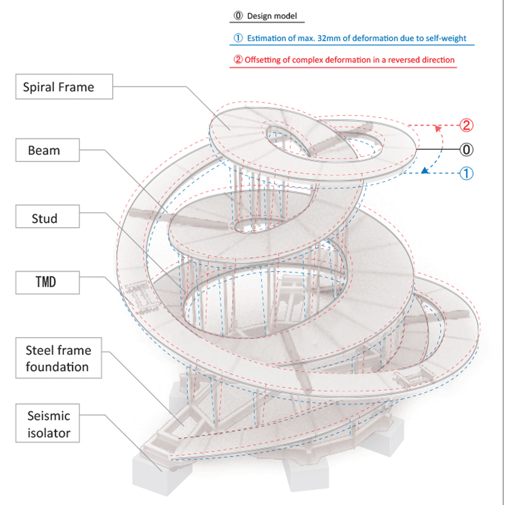 وظیفه پایدار نگهداشتن مارپیچ داخلی برعهده عناصر ستون مانند میانی است. این عناصر سازهای از جنس فولاد و به قطر 100 میلی متر میباشند. مارپیچ بیرونی به صورت یک طاق نما به مارپیچ داخلی وصل میشود. به منظور کم کردن حجم قاب فولادی در قسمت فوقانی، از یک سیستم جداسازی بر پایه دستگاه های آونگ گون برای ساختمانهای سبک استفاده شده است. در سه مکان در پله مارپیچی بیرونی که بیشترین نگرانی را در مورد لرزش ناشی از تردد احساس می شد، یک نوع دمپر جرم تنظیم شده از نوع ( TMD ) برای کنترل لرزش بکار برده شده است.