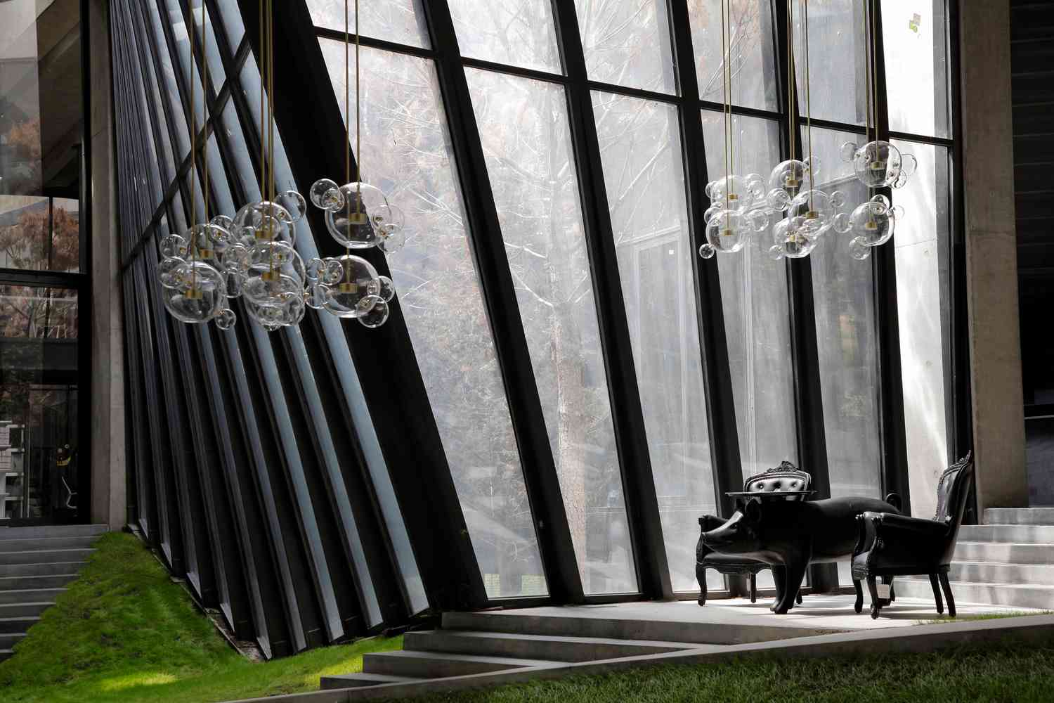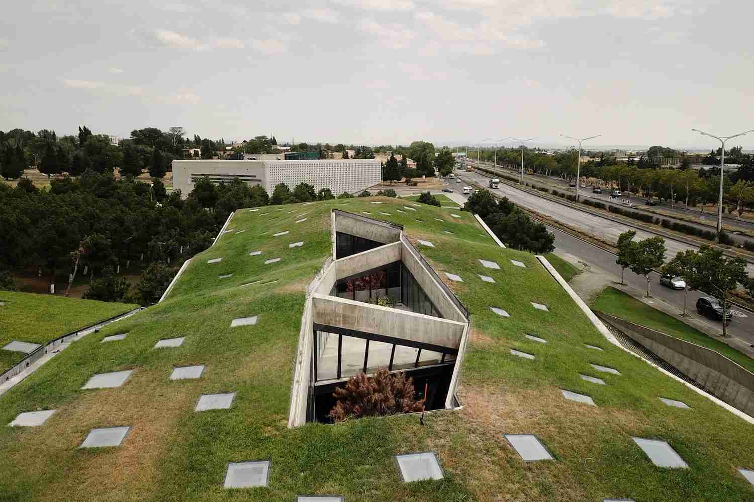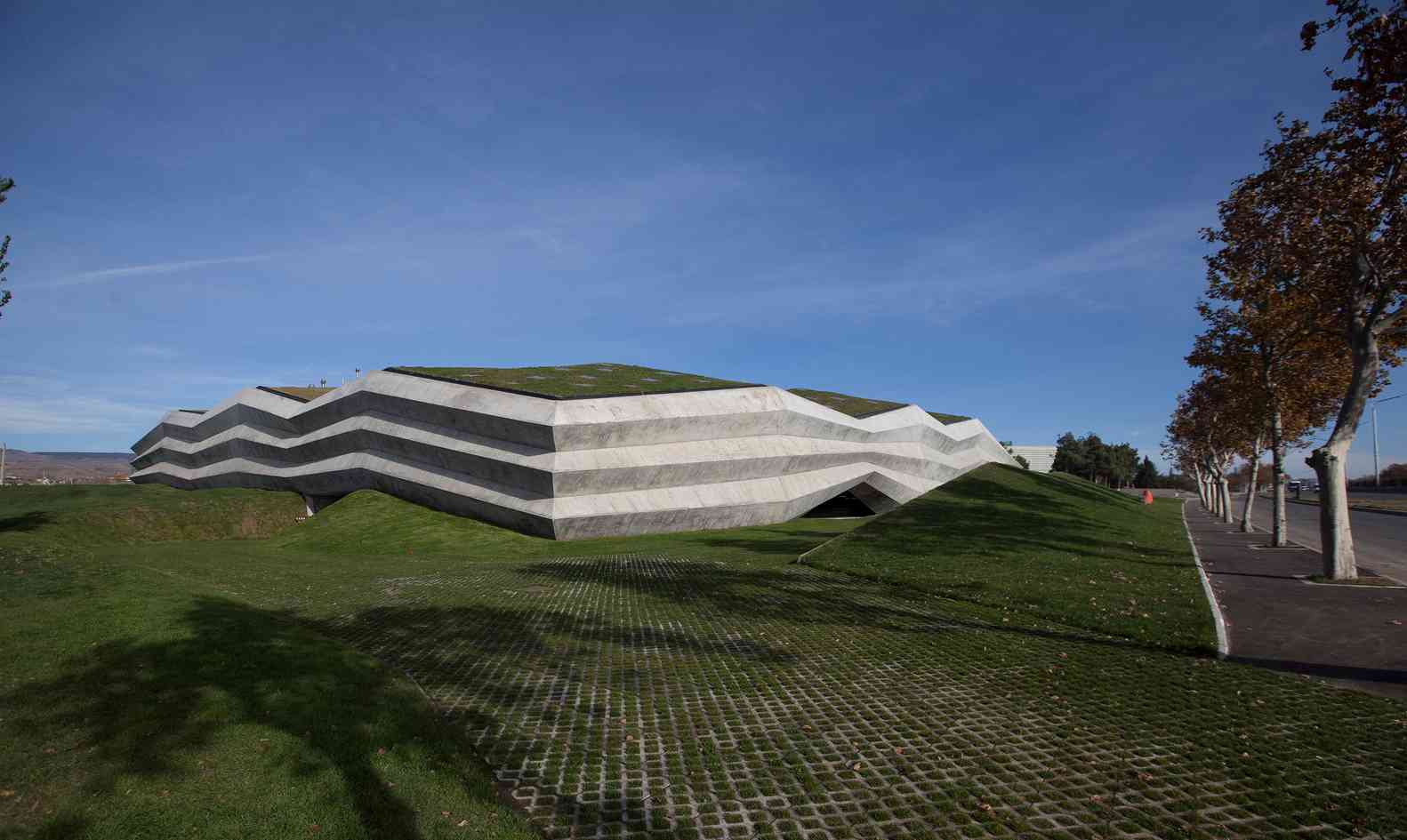 سه دهلیز پر از پوشش گیاهی و پنجره های سقفی متعدد ، نور روز را به فضاهای زیرین می آورند. دیدن توده حجیم و یکپارچه ای بدون باز شدگی های قابل مشاهده موجب کنجکاوی می شود. در حالی که فضاهای داخلی این بنا به واسطه وجود تراسها، تماناً به سمت پارک و آسمان جهت گیری شده اند. نمای تمام بتنی ساخاتمان به شکل یک منحنی دوگانه چین خورده است. ظاهر بنا در طول روز با حرکت خورشید و ایجاد سایه روشن های مختلف در ساعات متفاوت تغییر پیدا میکند.