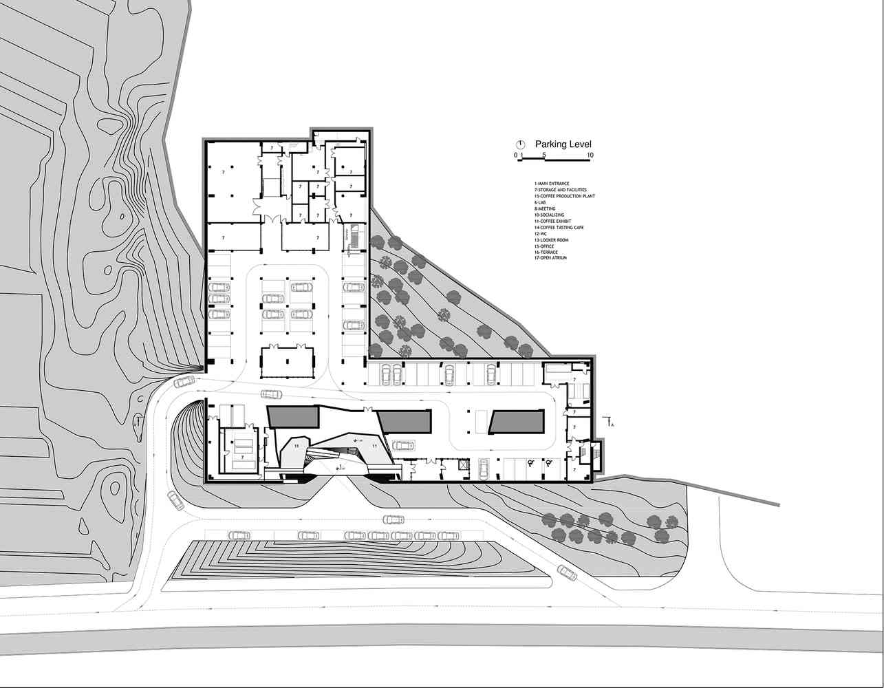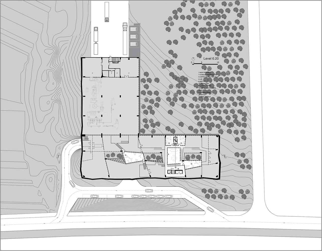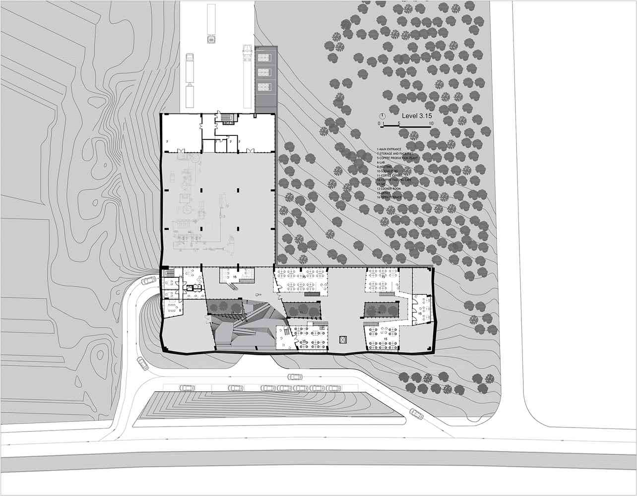 سایت این پروژه میان انبوهی از درختان کاج درمنطقه ای کمتر توسعه یافته و در جوار بزرگراهی که شهر را به فرودگاه متصل می کند، واقع شده است. این پروژه شامل کارخانه تولید قهوه و دفاتر آن، نمایشگاه های قهوه و بخشی برای چشیدن طعم قهوه تشکیل شده است.