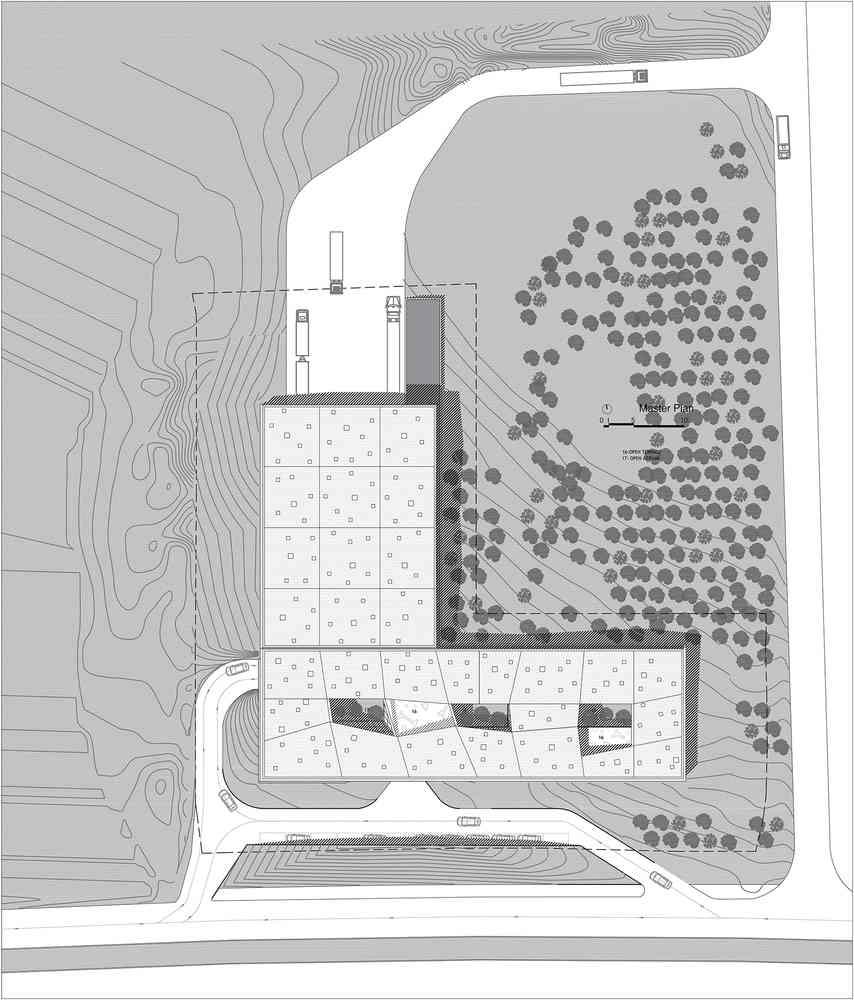 در داخل بنا ، تمامی کاربری ها در فضایی باز و بدون مانع چیده شده و با پارتیشن های شیشه ای از هم جدا می شوند. ساختمان این پروژه از سمت بزرگراه همانند یک حجم بتنی چین خورده بدون مدخل و باز شدگی که فعالیتهای داخل آن را مشخص کند، دیده می شود.