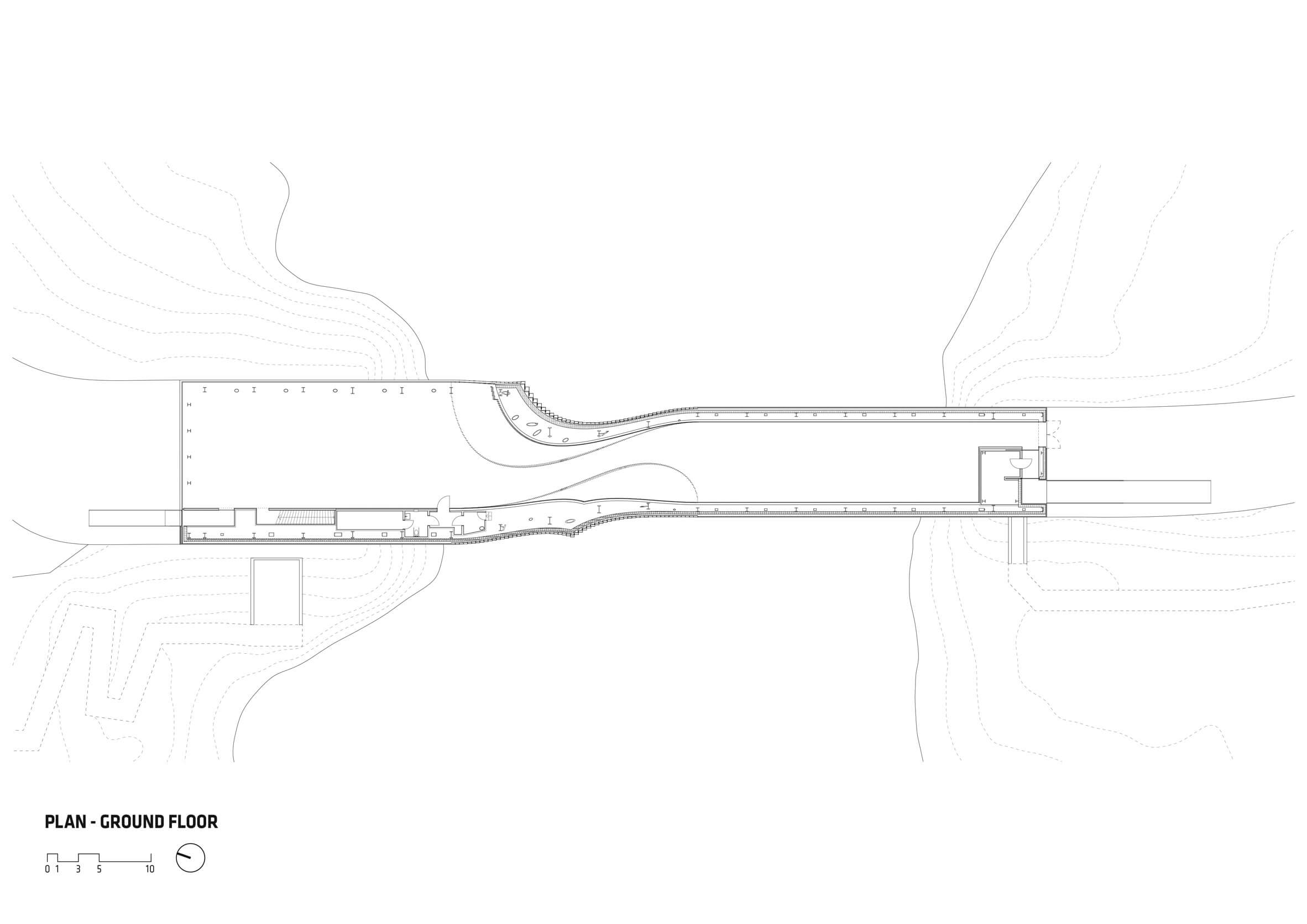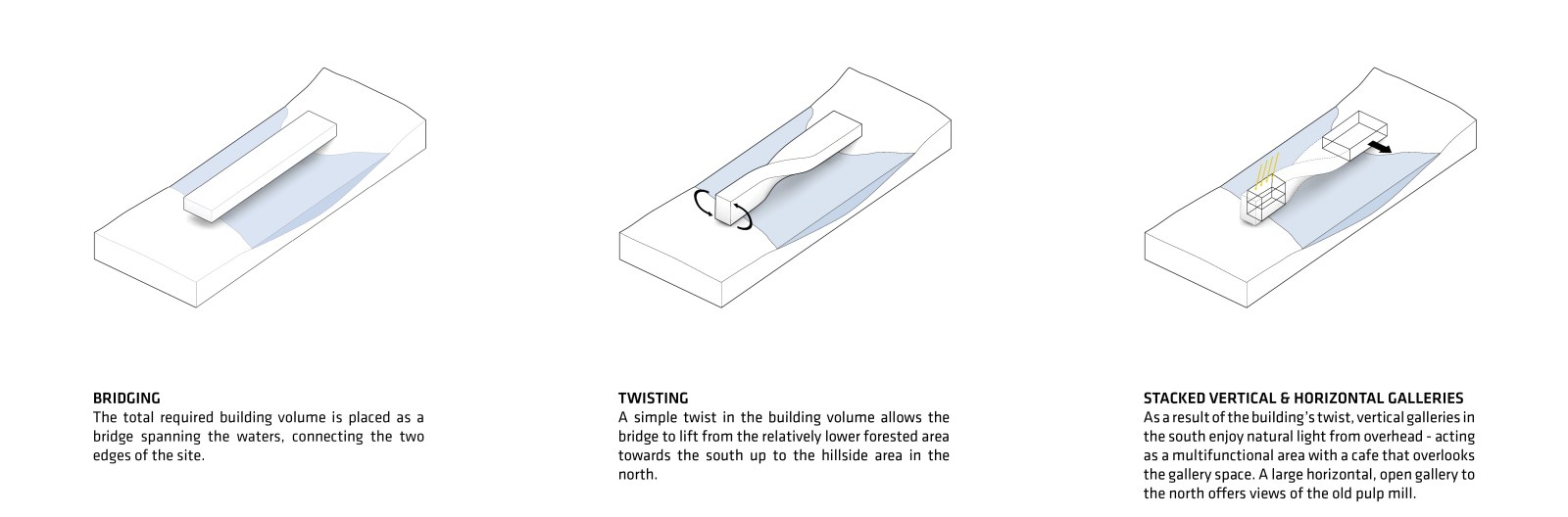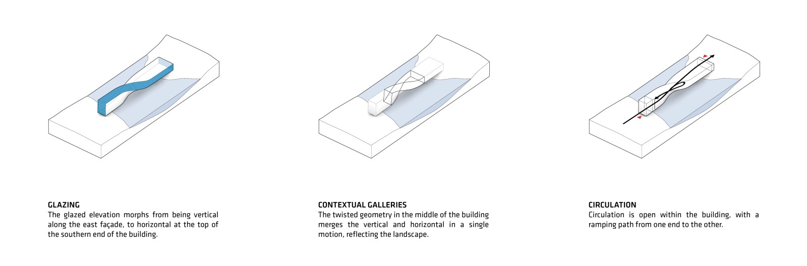 پیچ و تاب خوردن ساختمان حول محور مرکزی خود با در نظر گرفتن پستی و بلندی های موجود در ساحل رودخانه بوده است. از طرف دیگر این بنا با ارایه راهکاری مبتکرانه برای عبور از رودخانه موجب بهبود سیرکولاسیون مجموعه می شود.