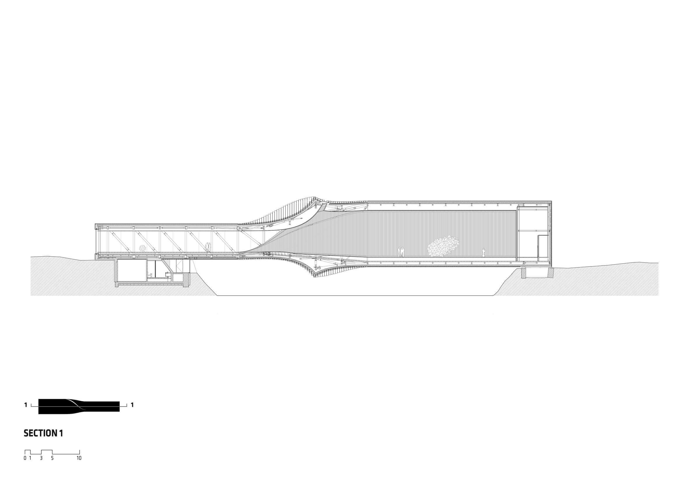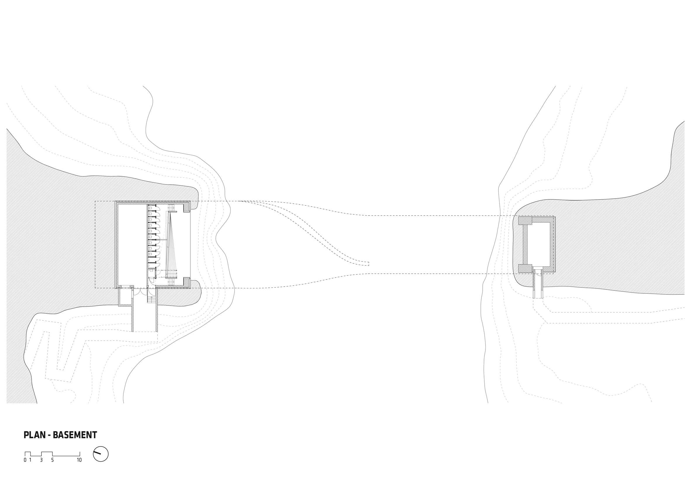 ساختمان با زیر زمینی که در زیر قسمت شمالی قرار دارد کامل می شود. جایی که از بتن و شیشه پوشانده شده و نمایانگر امتداد بصری رودخانه است. در این فضا حمام هایی وجود دارند که با کارهای هنری آراسته و تکمیل شده و به سمت پل دید دارند.