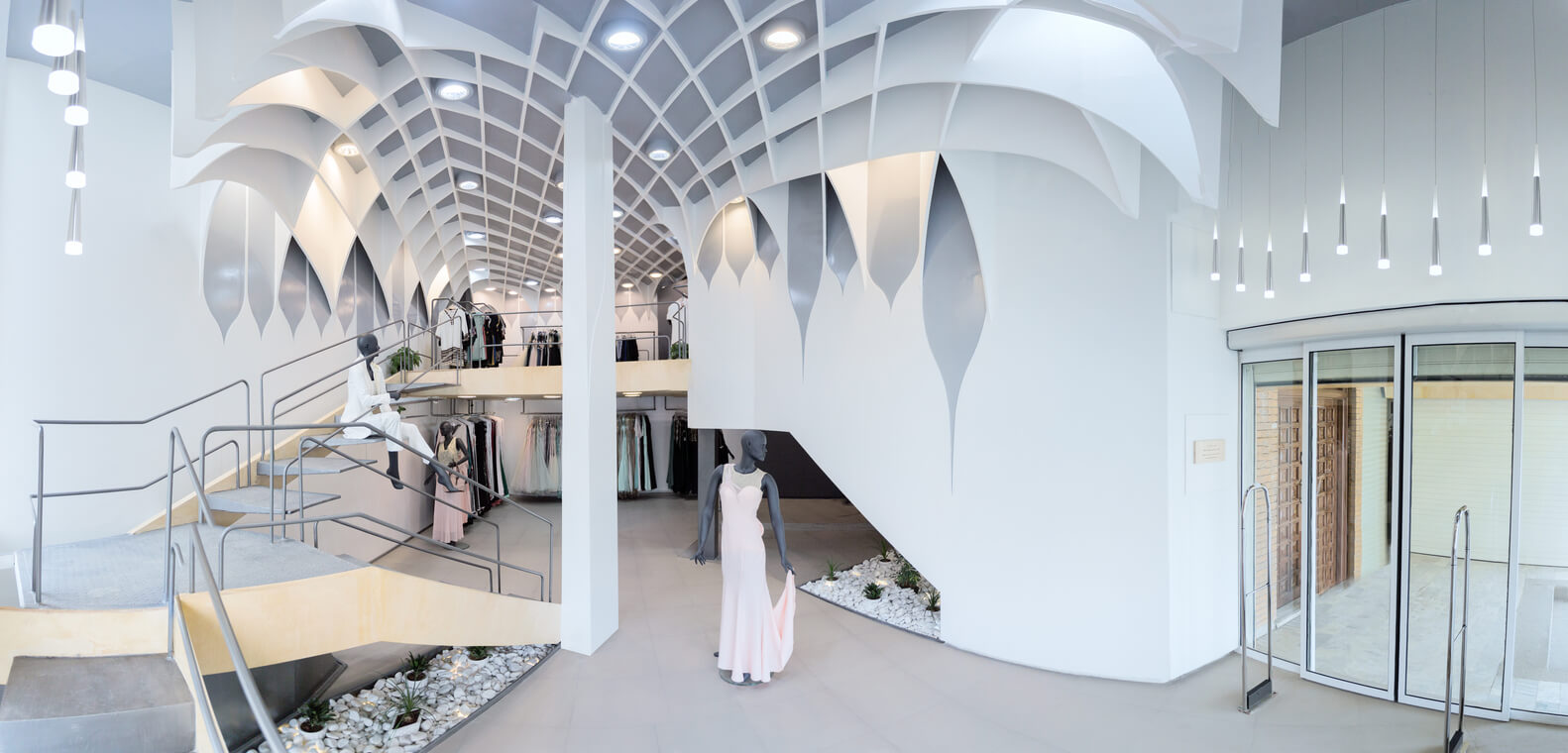 نرده و پلههای راهپله در حالی که هر یک به عنوان یک شئ جداگانه دارای ساختار و پیکربندی خاص خود هستند؛ در انتها به مکانهای مجلل و آویز لباس تبدیل میشوند که ساختاری مستقل، مداوم و یکپارچه را تشکیل میدهند. چه در قسمت بالا و چه در طبقه همکف، این نردهها از لولههای یکپارچهای تشکیل میشوند که در فاصله 50 سانتیمتری از راه پله و غشای اصلی به صورت ممتد اجرا شدهاند.